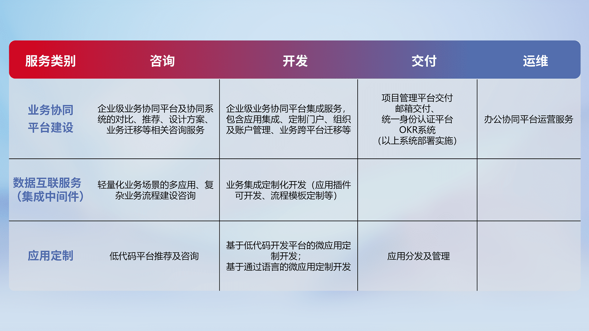 针对钉钉、、、、企微、、、IDaas等平台级产品提供产品的规划、、方案、、、交付、、、、定制化开发等服务,,,,实现如统一协同办公、、、智能客户服务、、、混合会议管理、、、、智能数据查询、、等业务场景,,,,实现数字化转型。。